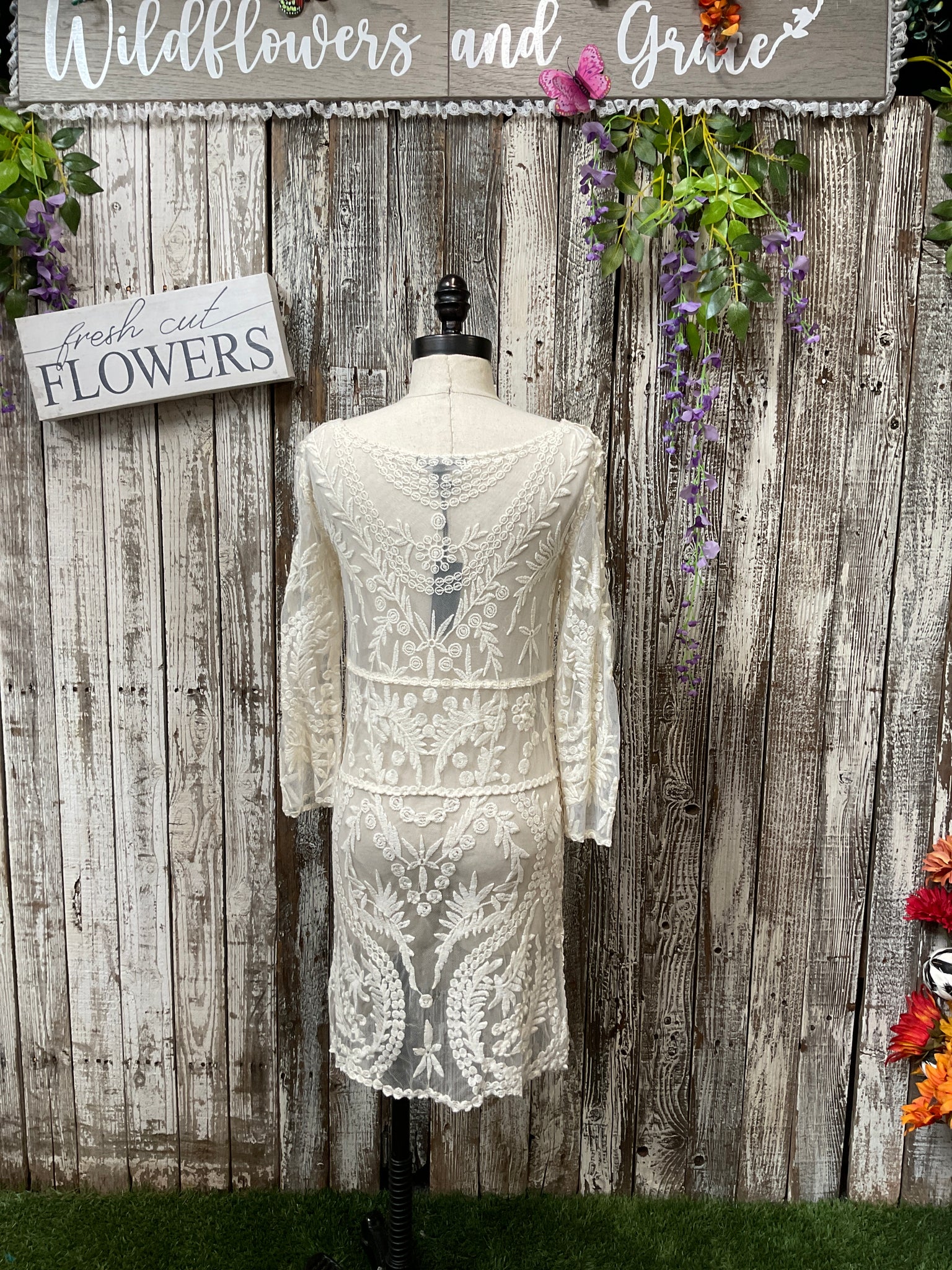 Creme, Sheer, Long Sleeved, Scoop Neck, Laced Mini Dress