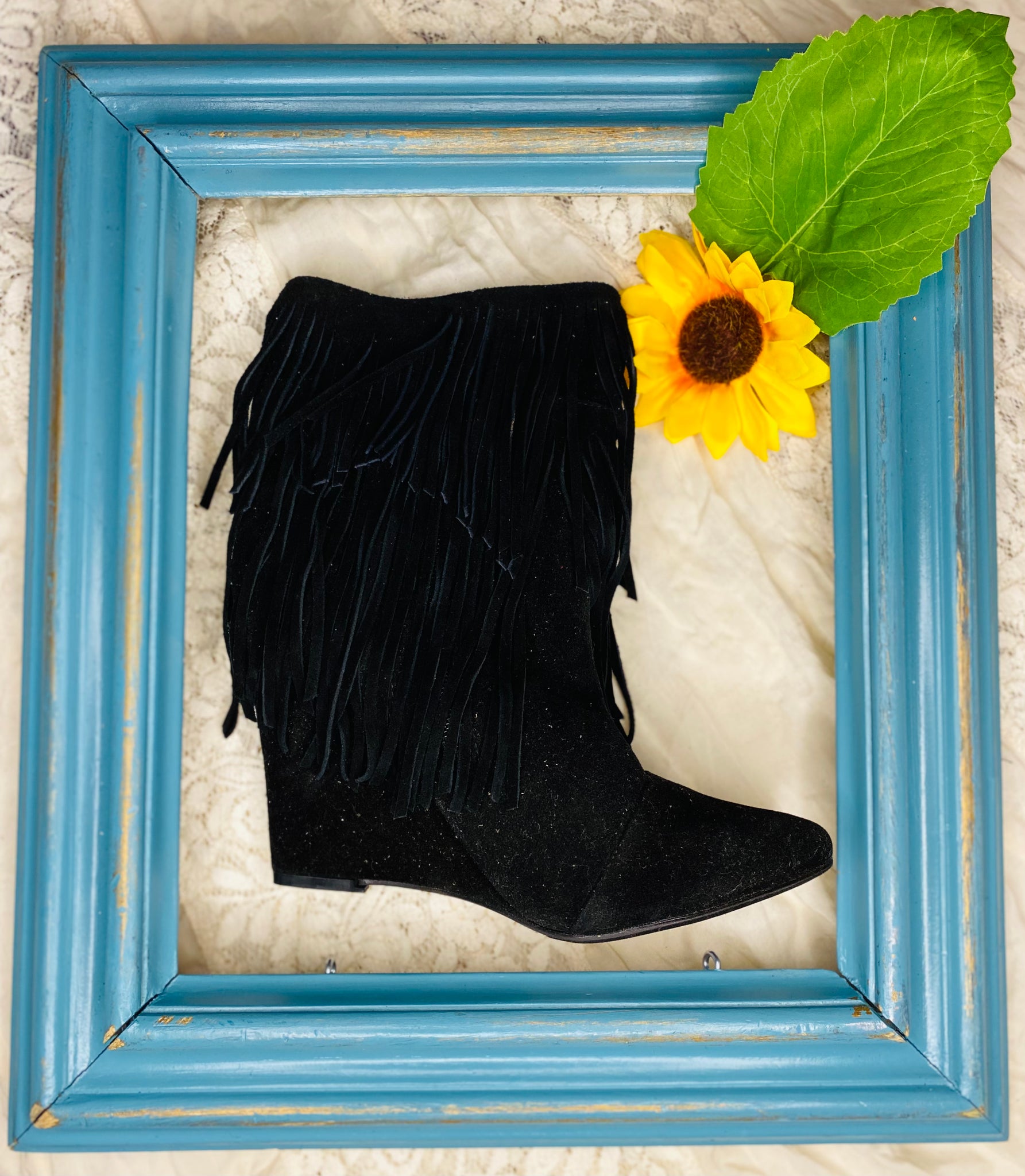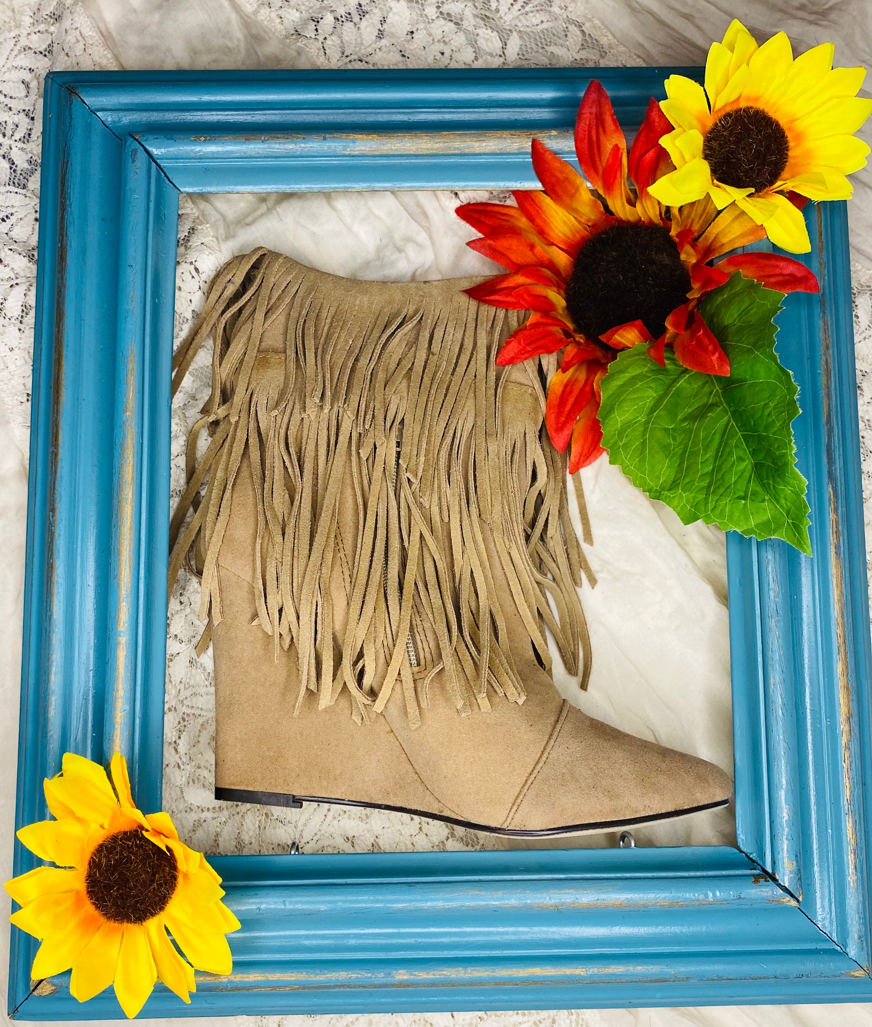 Leather above the ankle wedge bootie within 3 inch heel. Fun with a little long fringe detail.