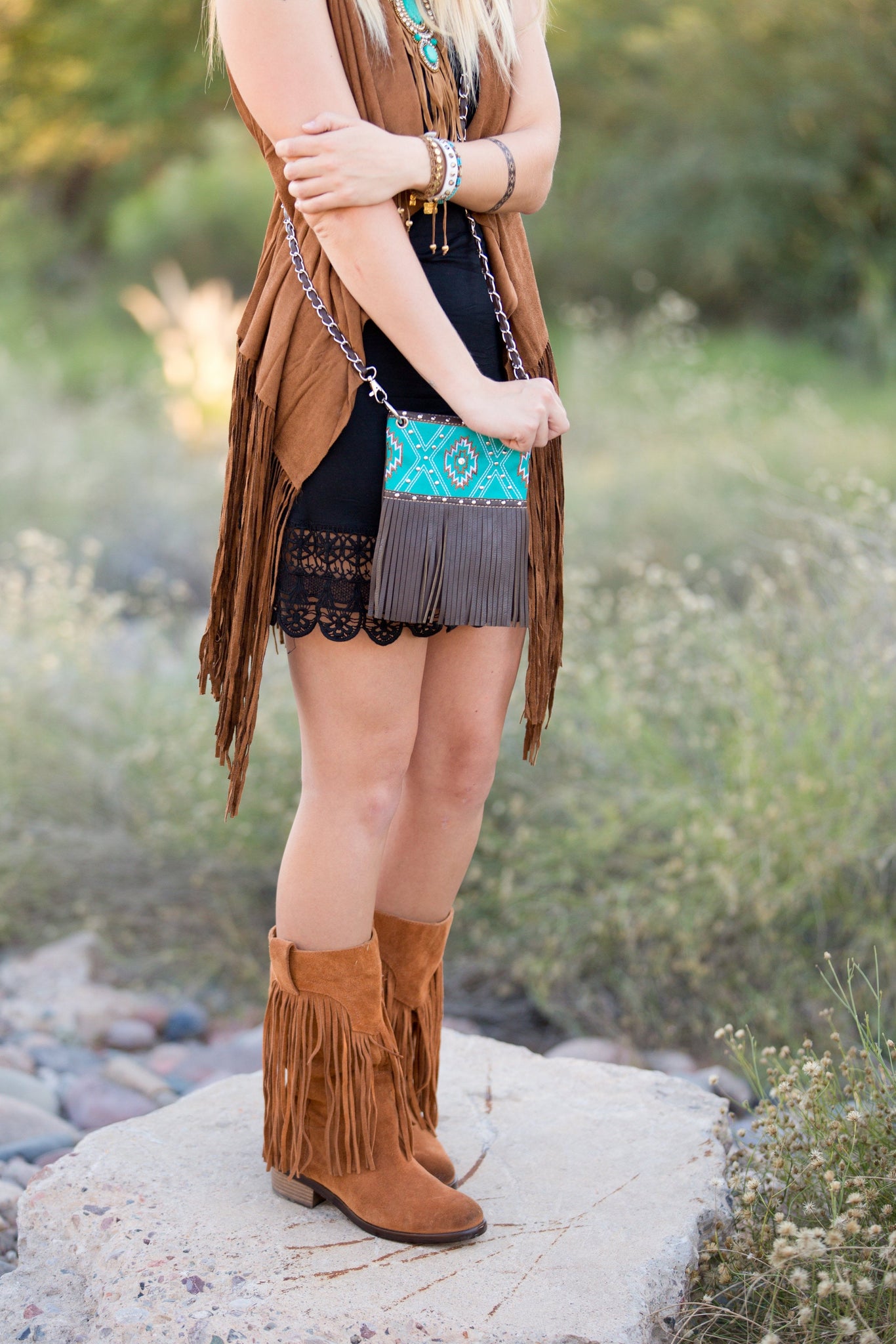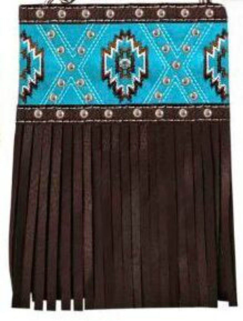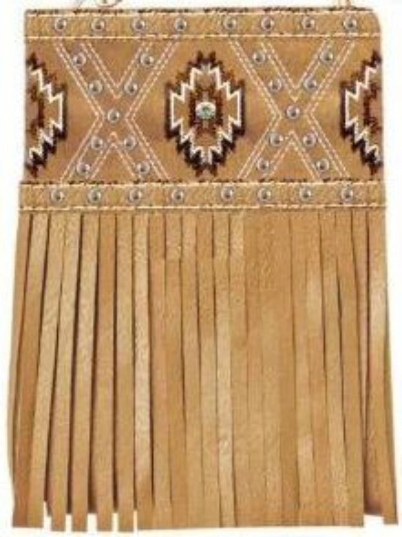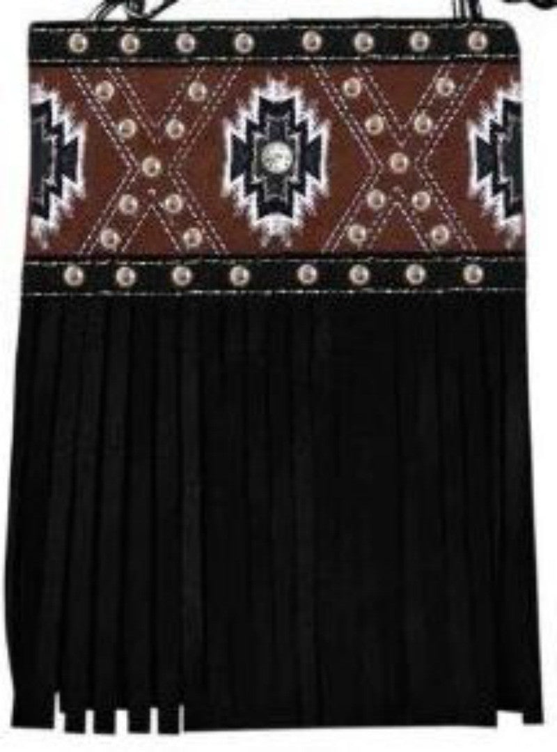 The Chic Bag crossbody handbag -AZTEC PRINT AND FRINGE Outside Pocket is Open Sleeve 2 Pockets on the inside - one main and one small. Measurements 6x8x1