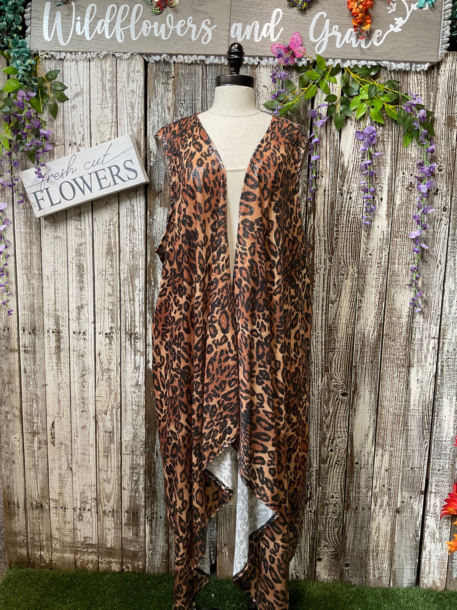 Black/Brown/Taupe Leopard print and fully sequenced, Front Flaired, Vest Cardigan w/ pockets