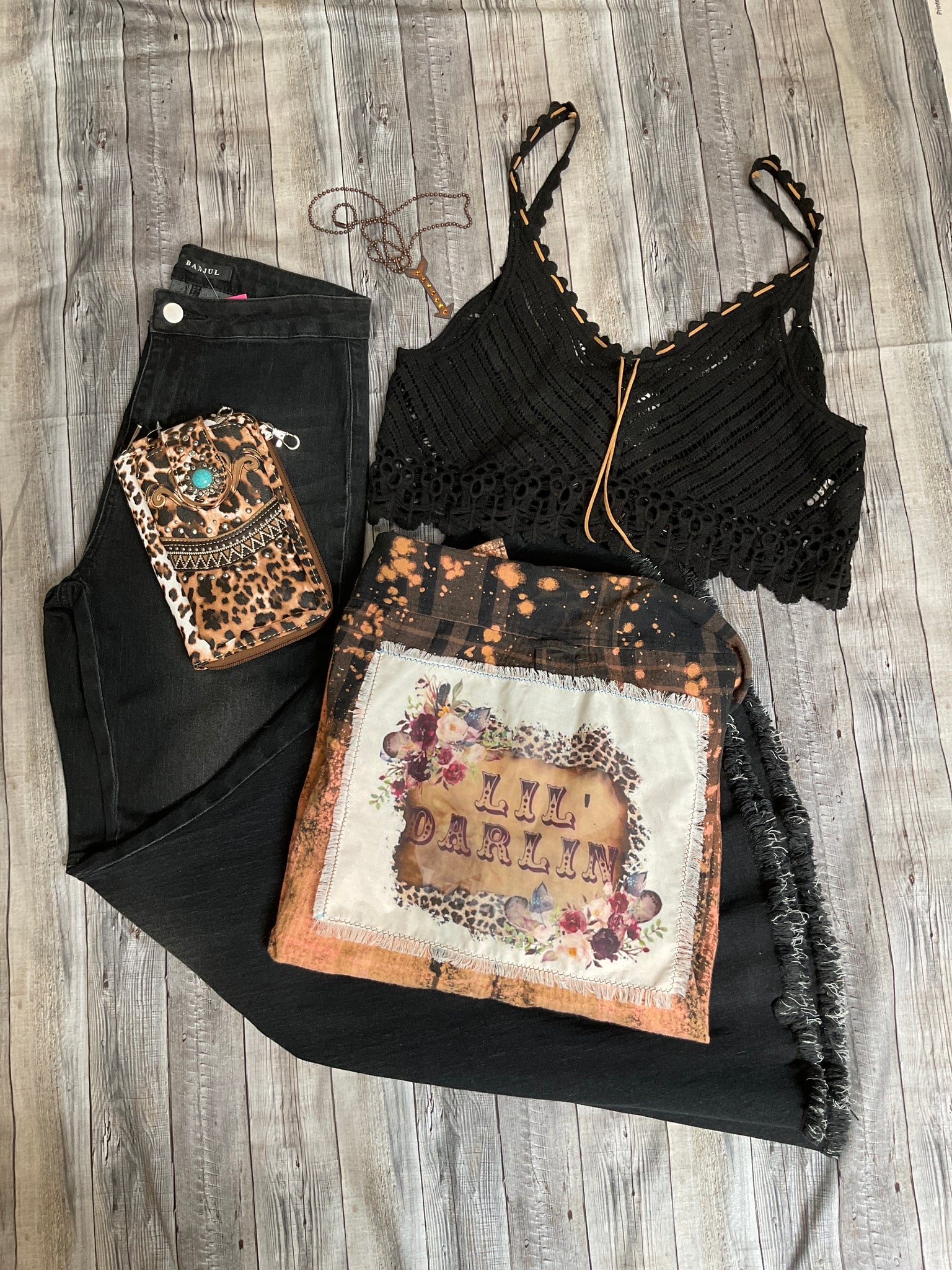 Large “Cotton On Garments” Flannel w/ “Lil’ Darlin” quote on back & Lace trim on Fron Left Breast pocket. Size Large. Runs true to size