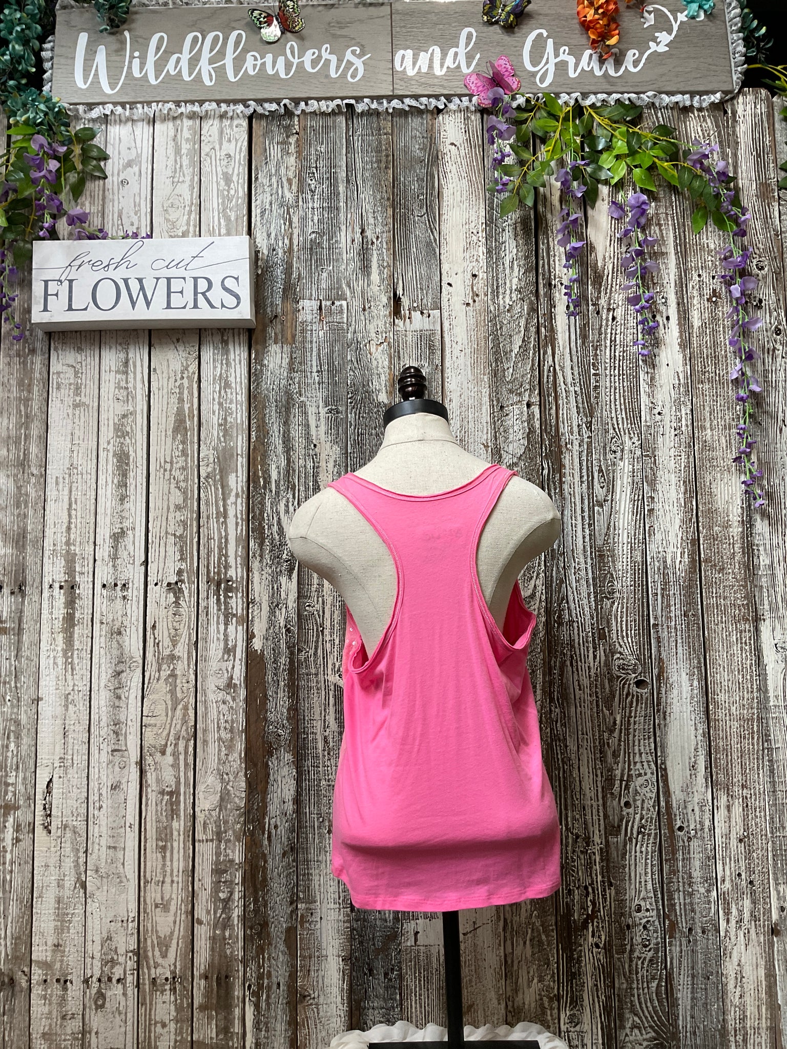 Cotton/Polyester Florescent Pink, Racerback Tank, w/ Meshed Sequence covering Front of Tank