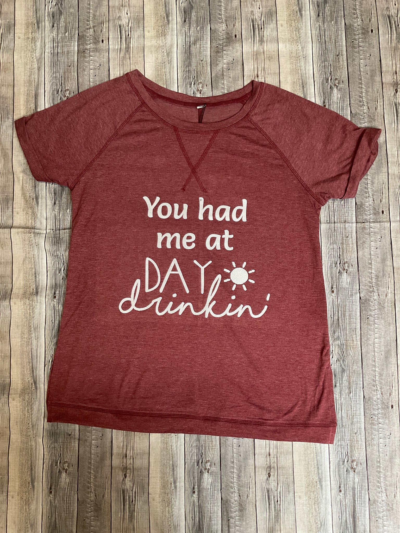 Mauve, Short Sleeved Small Top w/ “You Had Me at Day Drinkin’” Quote in White Glitter Vinyl