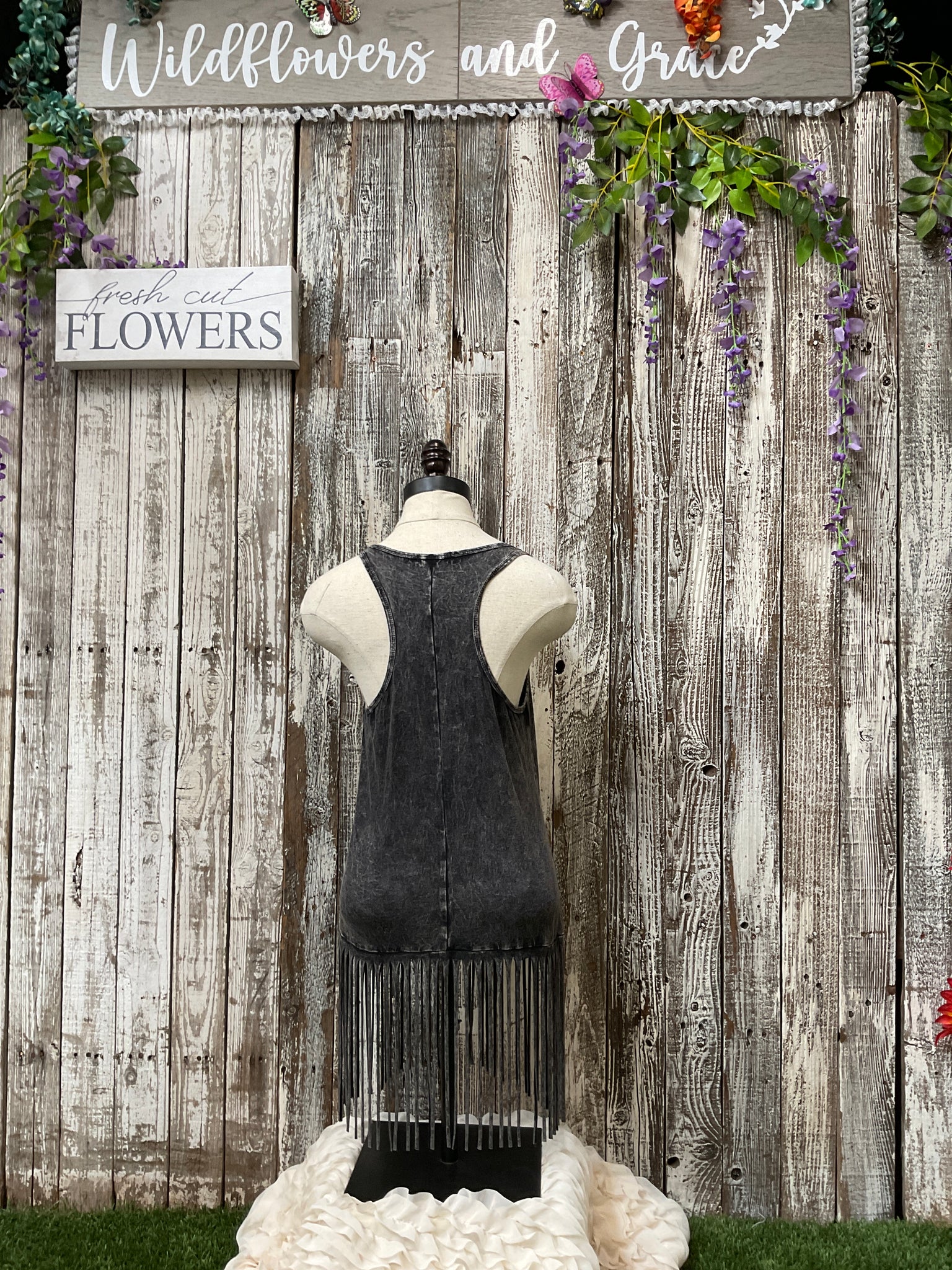 Grey, Viscos/Spandex, Racer Back, w/ bottom Fringe w/ Blinged out “Shhh…I’m Hunting Cowboys” saying in front design.