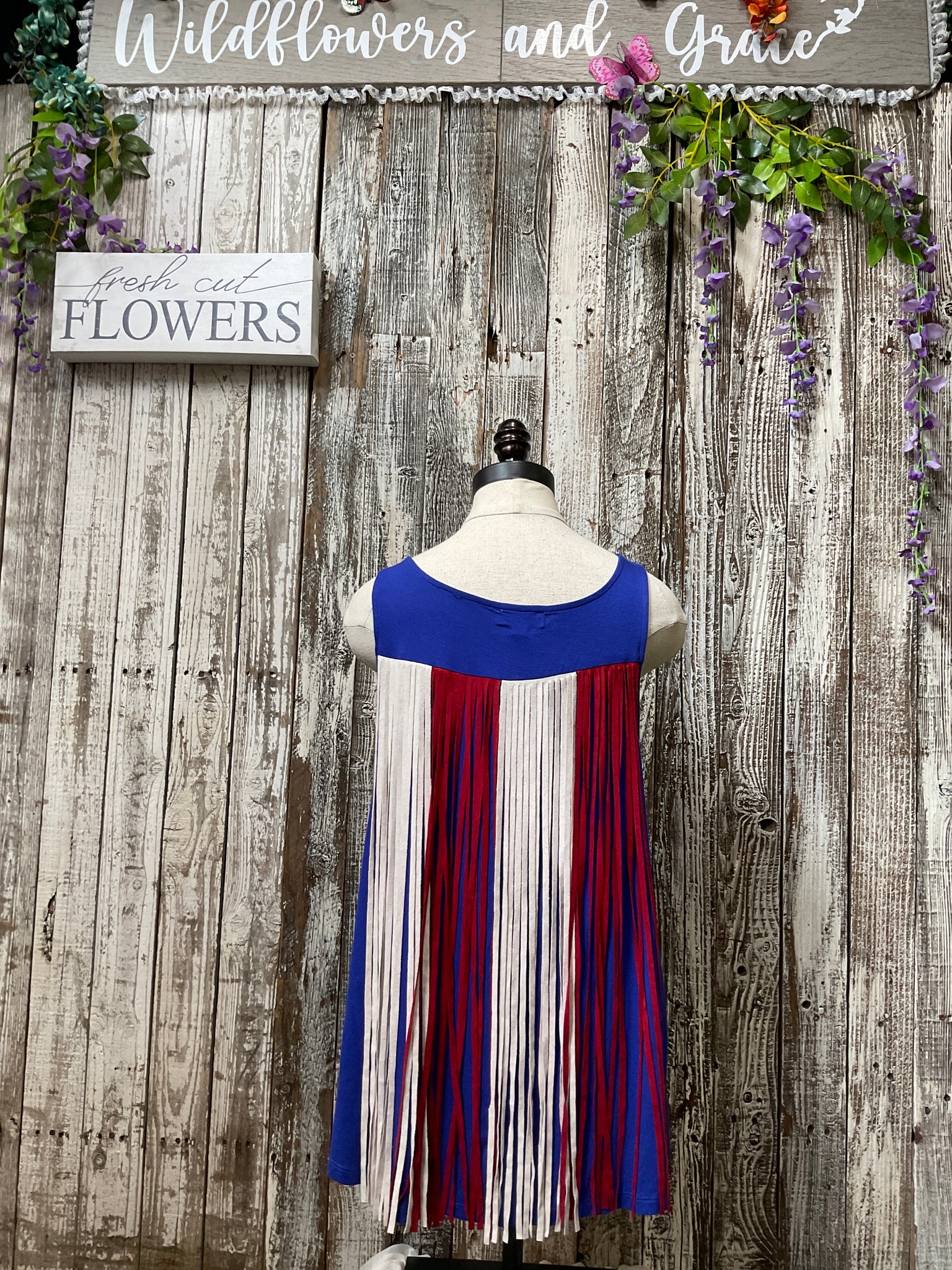 Cotton/Polyester, Royal Blue Tank w/ Front Left Breast pocket w/ 3 White Stars, & has a beautiful trim of White/Red Suede Fringe hanging down in Strip Format