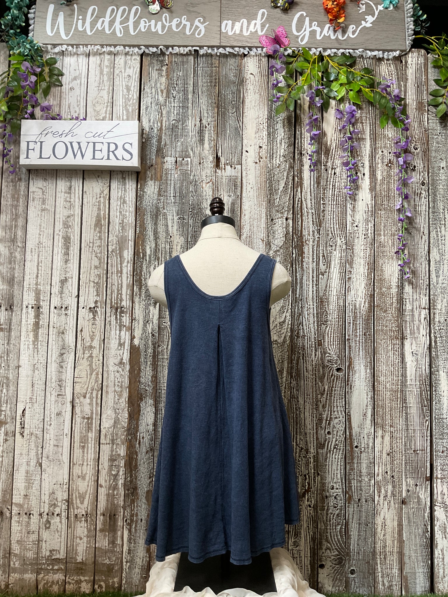 Beautiful Denim Blue, Tank Top w/ a Pleated Open Back, Side Flairs, & Signature Swarovski Crystal Stud Covering Front of Tank