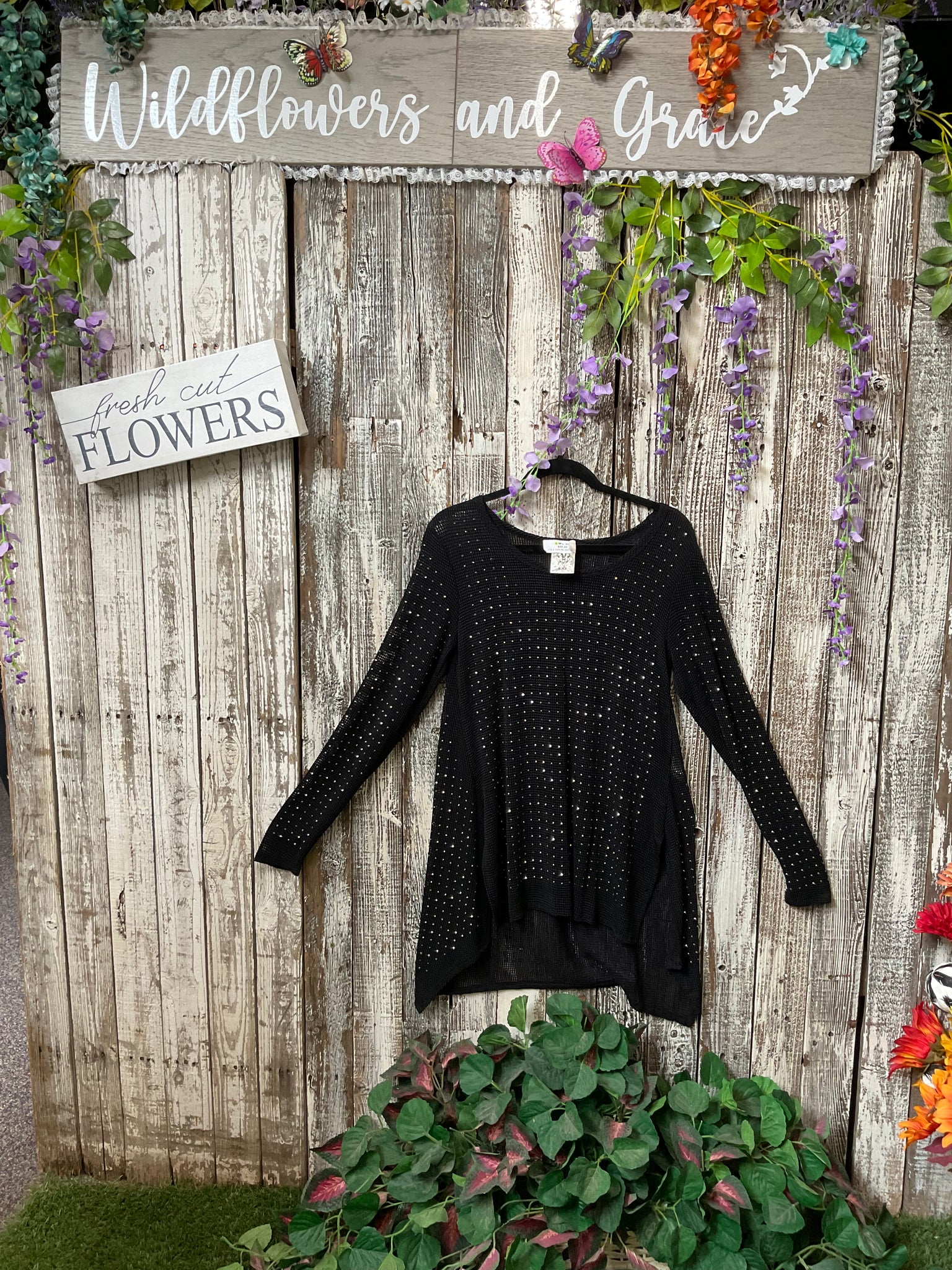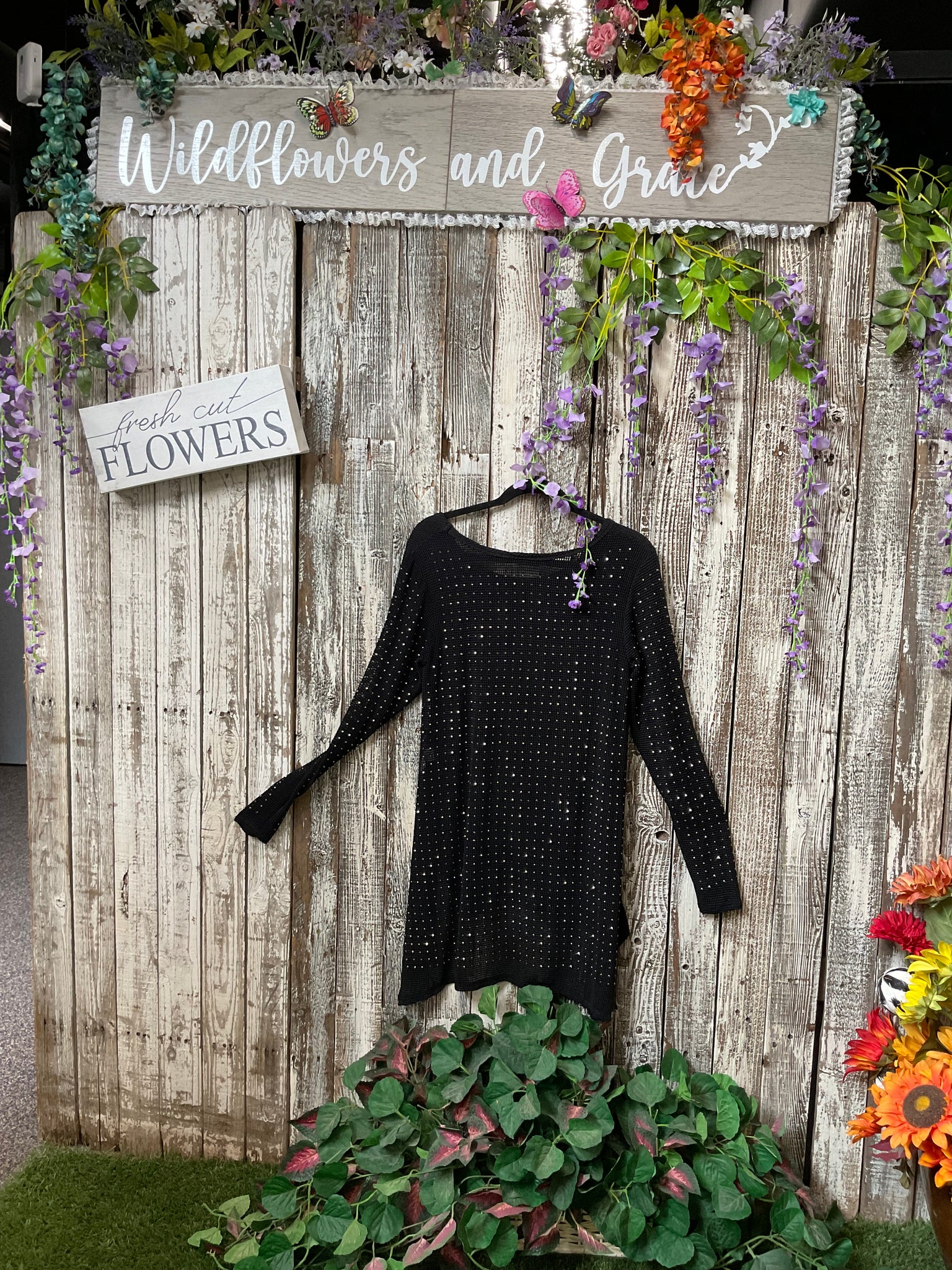 Black, Sheer, Swarovski Crystal studded, Long sleeved top.