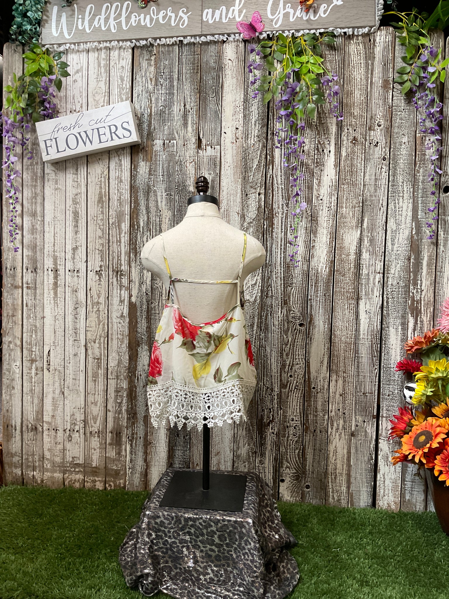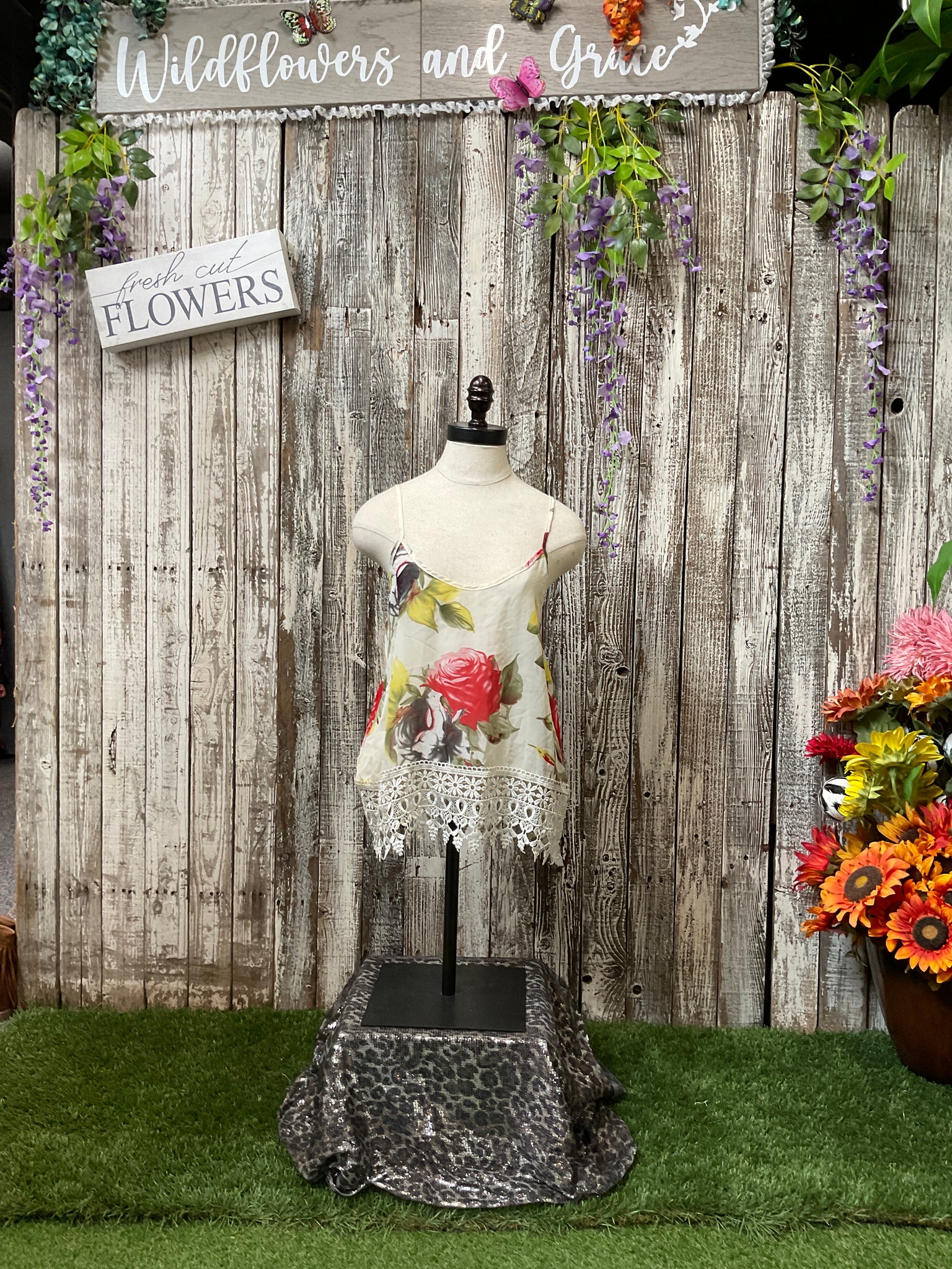 Floral Light Weight & Flowy Polyester, Boho Style, Lace Hemmed, Spaghetti Strapped Tank Top