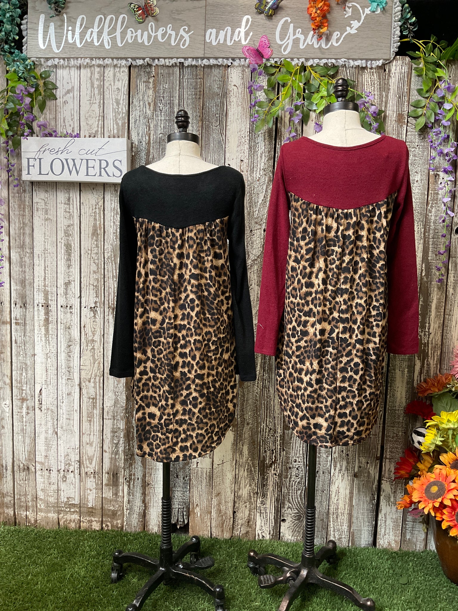 Cotton/Spandex Crew Neck, Long Sleeved Top w/ Gold Sequenced Breast Pocket, w, Back pleated, Leopard print, Flared, Low Back