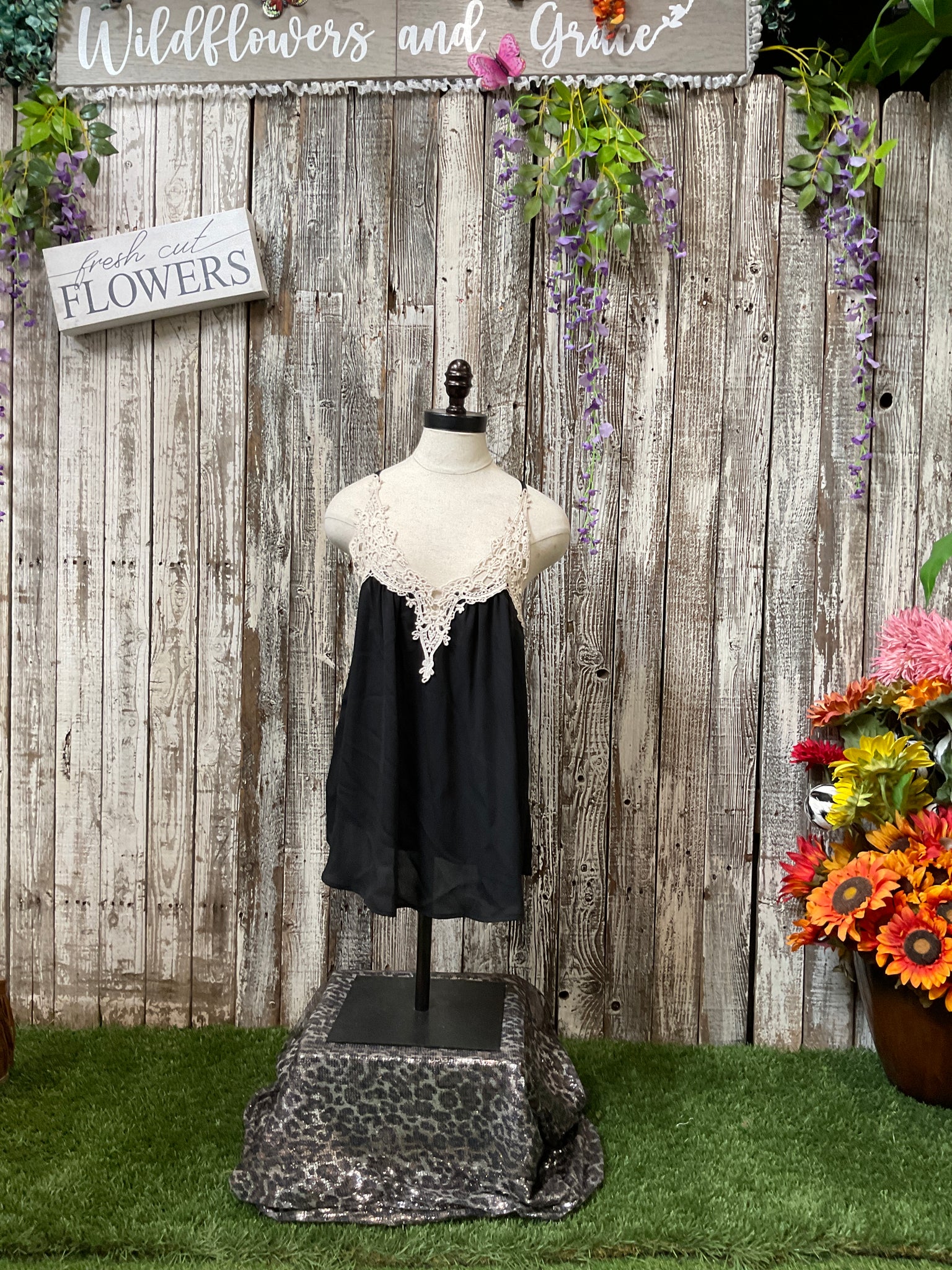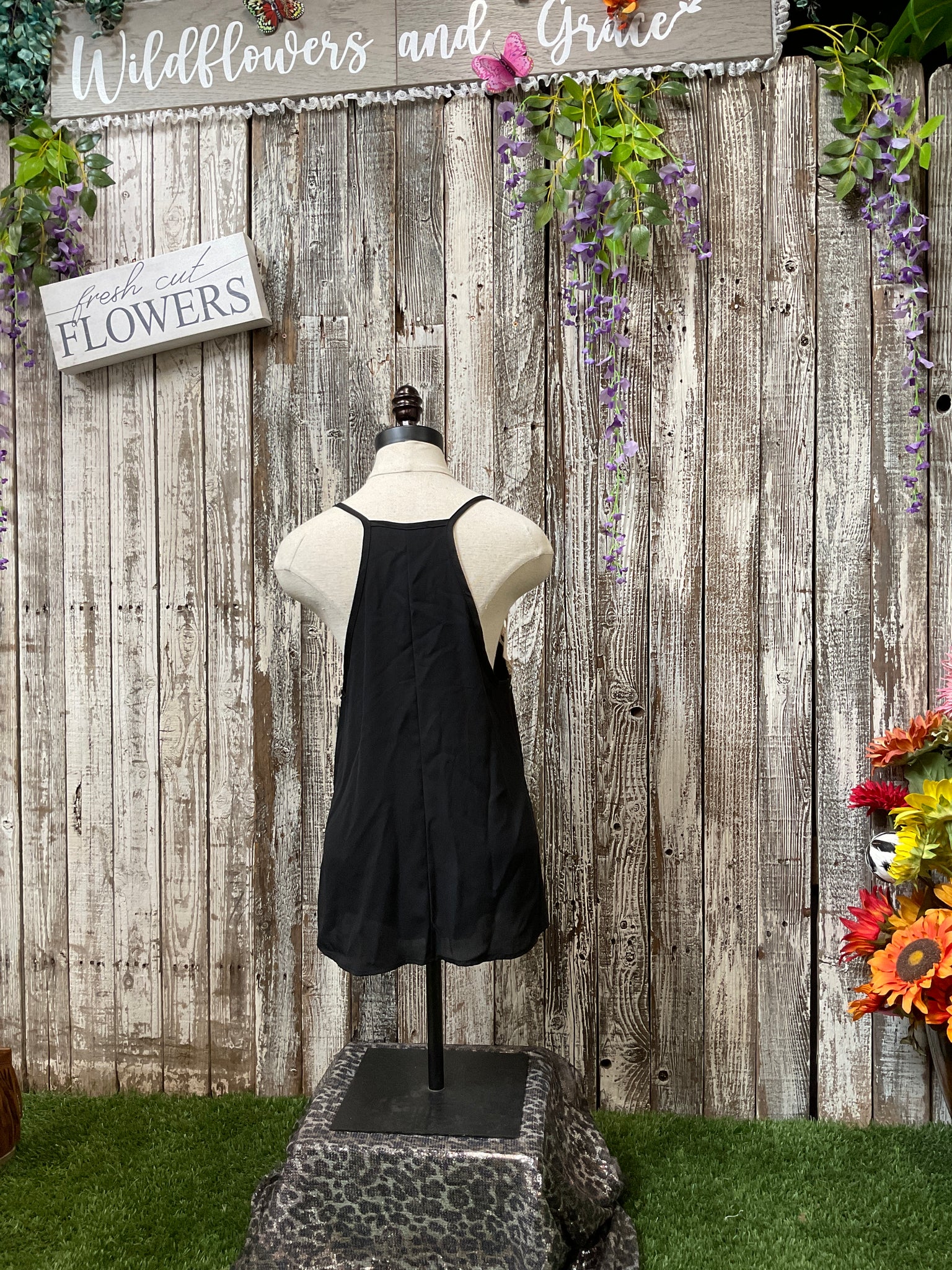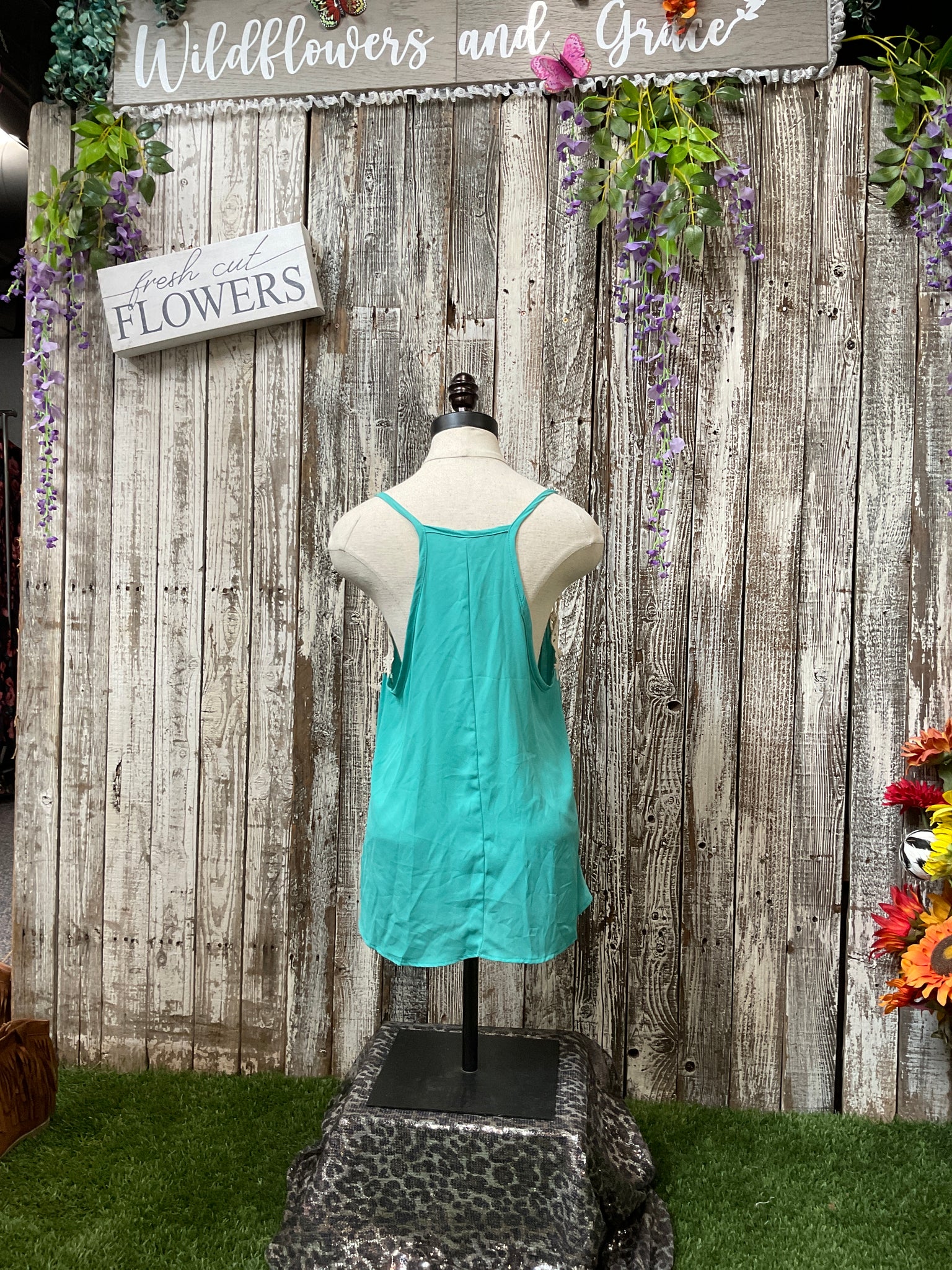 Light & Flowy Polyester, Laced Trimmed Neckline, Spaghetti Stapped Tank Top. Available in 2 colors