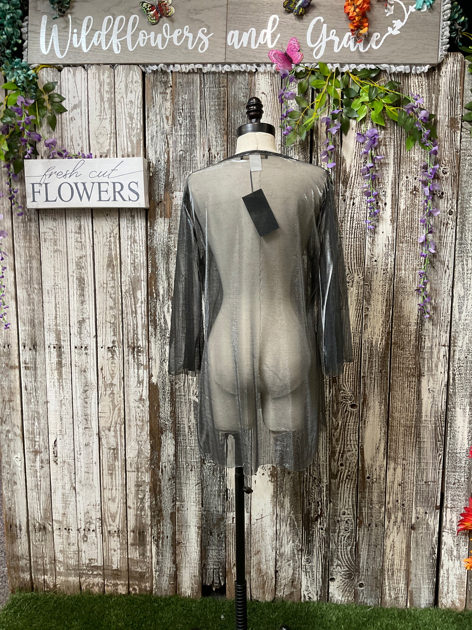 Pewter, Sheer, Mesh, Quarter Seeve Top w/ Front Keyhole w/ Collar