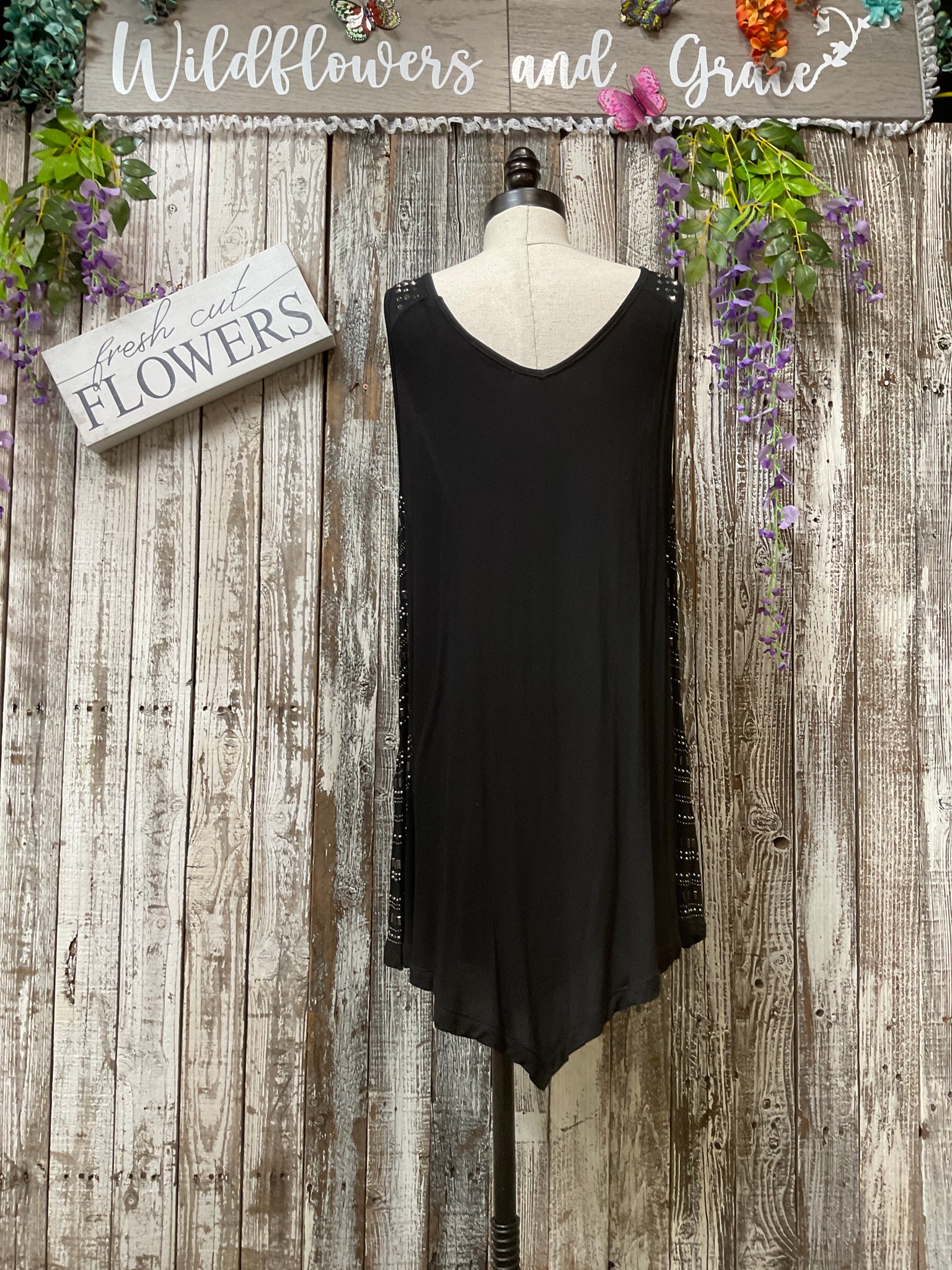 Black Deep V-Neck, Side Flaired, Tank Top w/ beautifully sequenced Large Cross design on front and sequenced designs running down the entirety of both sides