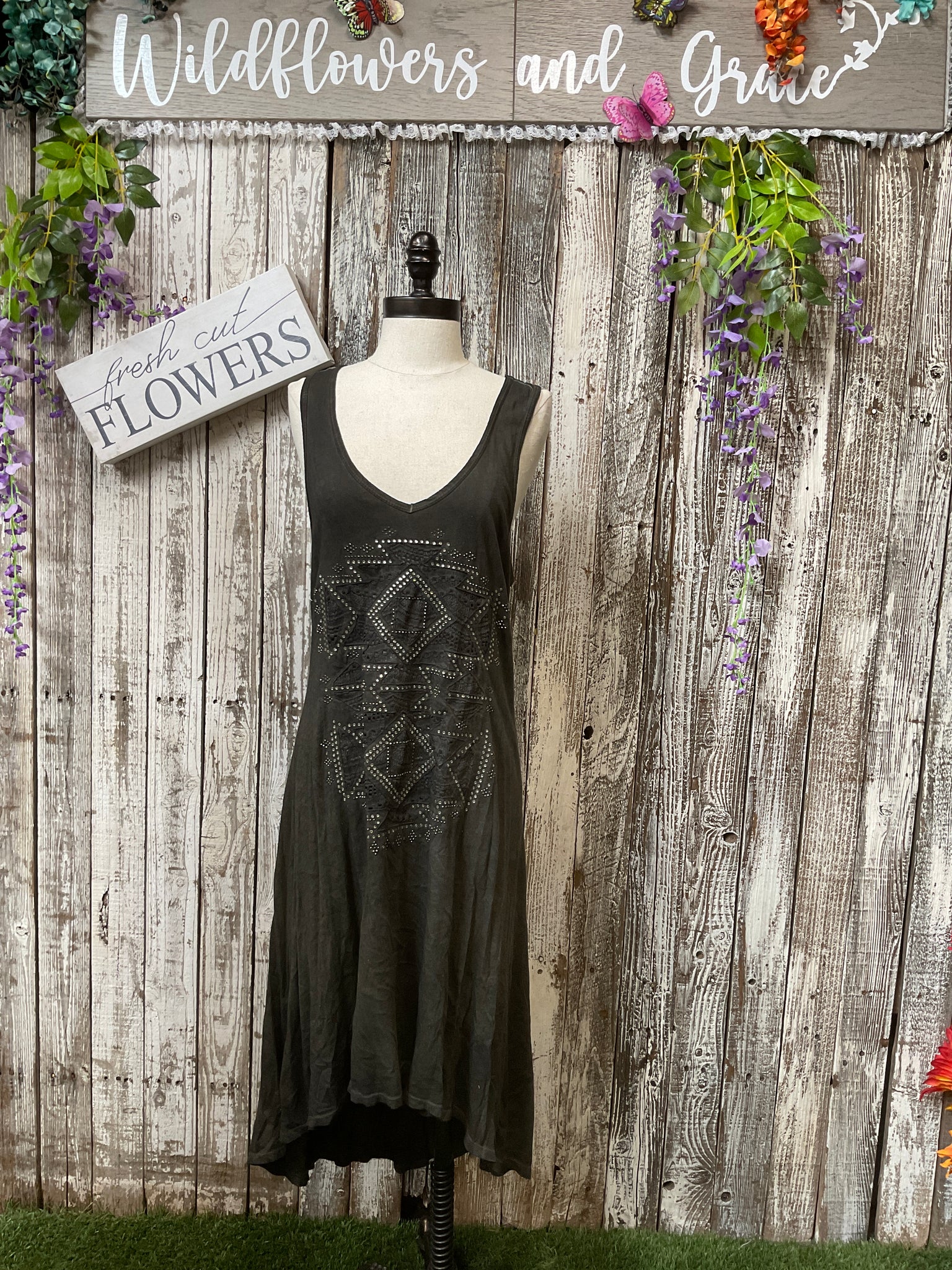 Dark Grey, Low V-Neck, RacerBack, High Front, Low Back Dress w/ Sequened Outlined & Sheer Laced Native Design covering Mid Section of dress